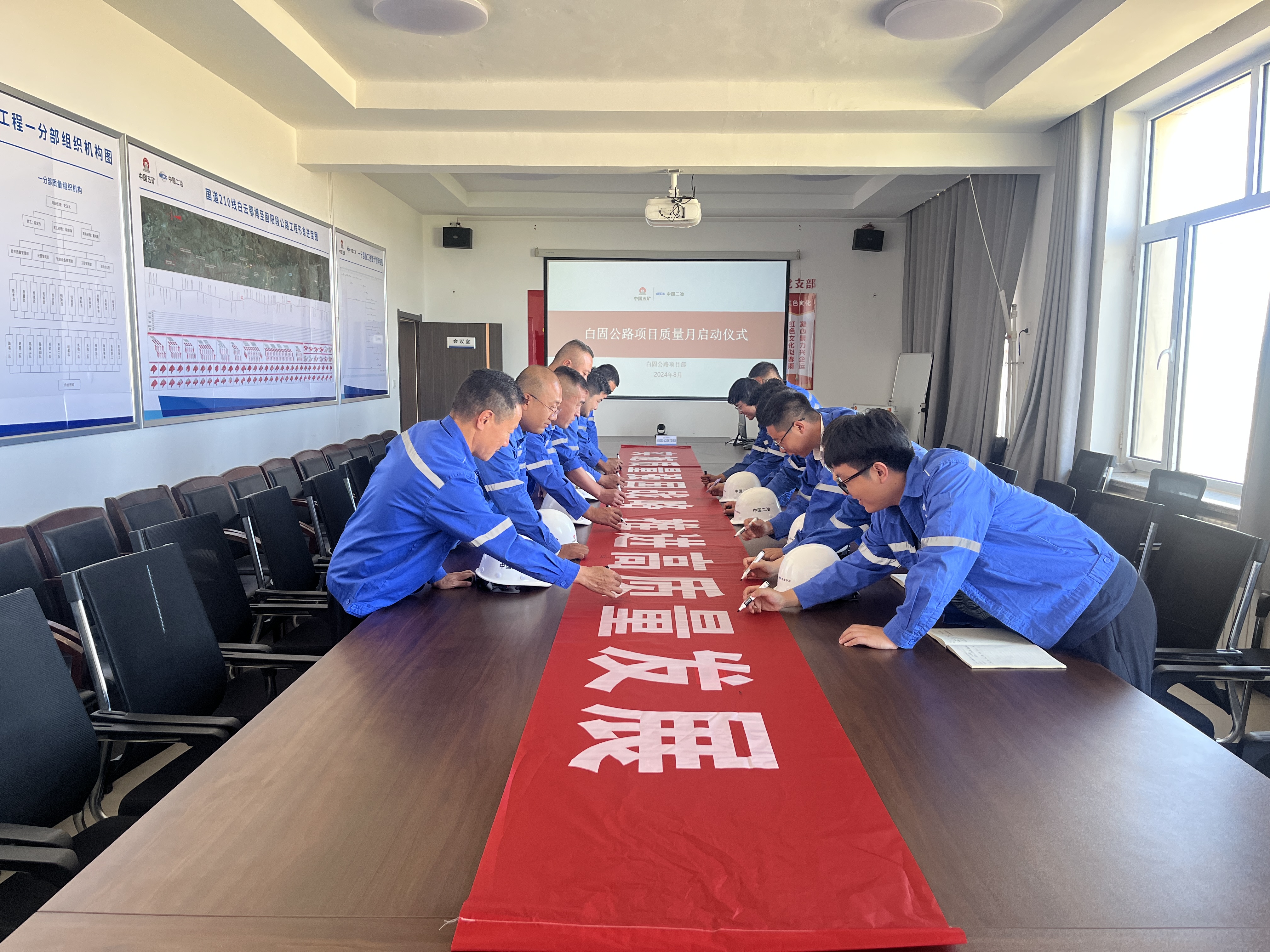 活動中,項目部全體管理人員在印有“實施質量強國戰略 推進高質量發展”的橫幅上簽字。
