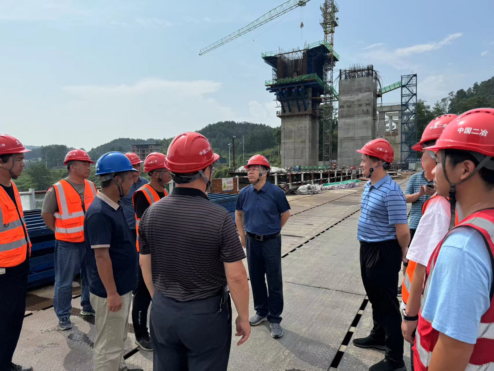 賀朝暉深入G59新新高速中國(guó)二冶承建標(biāo)段周家赧水特大橋進(jìn)行實(shí)地考察,重點(diǎn)了解關(guān)鍵部位的施工進(jìn)展及工程建設(shè)中存在的困難,并對(duì)背井離鄉(xiāng)建設(shè)湖南的一線作業(yè)人員表示感謝。項(xiàng)目部負(fù)責(zé)人就工程進(jìn)度、安全生產(chǎn)、防汛工作及項(xiàng)目存在問題等方面作詳細(xì)匯報(bào)。