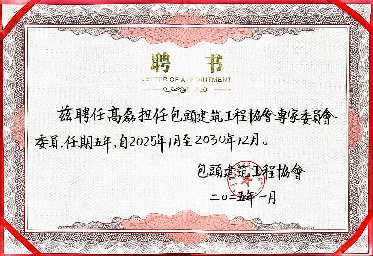 近日,中國二冶員工高磊被包頭建筑工程協會聘為專家委員會委員。