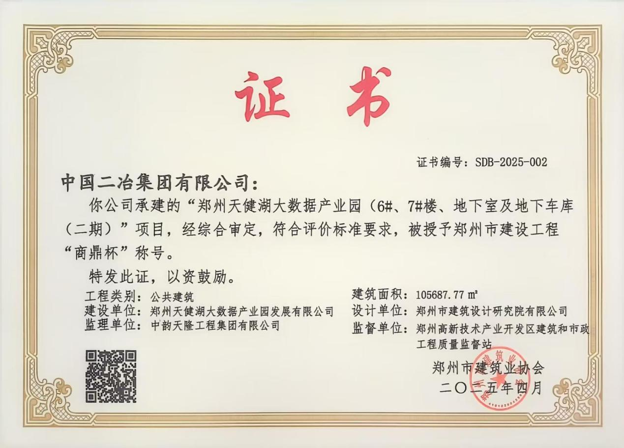 近日,鄭州市建筑業協會正式公布了2025年度鄭州市建設工程“商鼎杯”(市優質工程)獲獎名單,中國二冶鄭州天健湖大數據產業園6#、7#樓、地下室及地下車庫(二期)被授予鄭州市建設工程“商鼎杯”榮譽獎項。