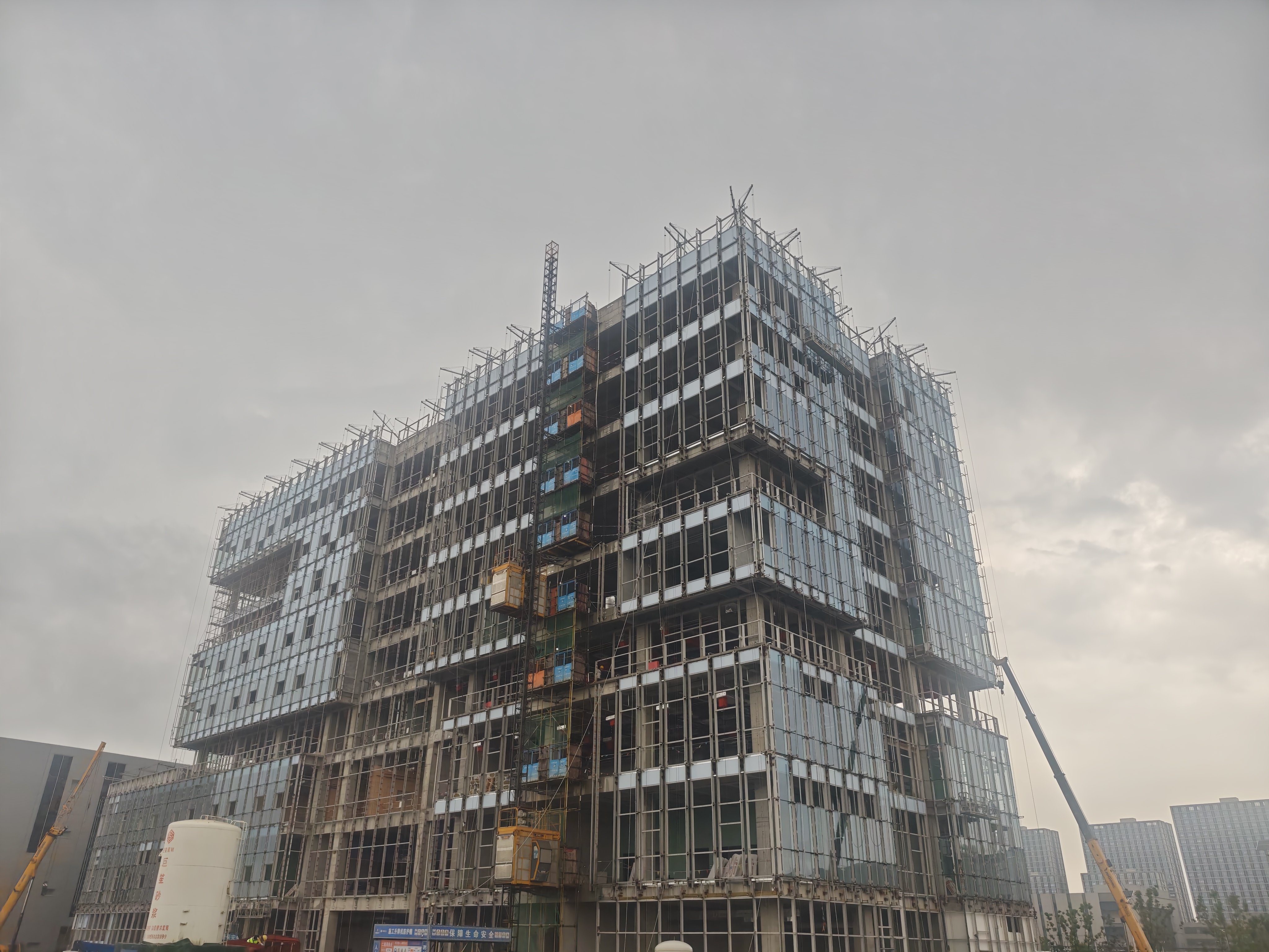 走進項目施工現場,繁忙有序的氛圍撲面而來:室內裝飾裝修工作緊鑼密鼓推進,施工人員緊盯墻面平整度、地面光潔度等關鍵細節,每一處工序都嚴格對標高科技芯片研發與生產的嚴苛環境要求,確保研發樓與生產廠區的內部空間既滿足功能需求,又符合精密制造的潔凈標準;室外玻璃幕墻施工同步展開,一塊塊兼具強度與節能性能的高性能玻璃,在機械協作與人工校準的配合下精準安裝,未來將勾勒出兼具現代美感與科技質感的建筑外觀,為產業園區增添獨特辨識度。值得一提的是,項目團隊在趕進度、保質量的同時,始終嚴守綠色建造理念,從環保材料選用到節能設備投入全程把控,力求實現工程品質與生態效益的雙向共贏,讓產業發展的 “科技感” 與綠色發展的 “生態感” 相得益彰。