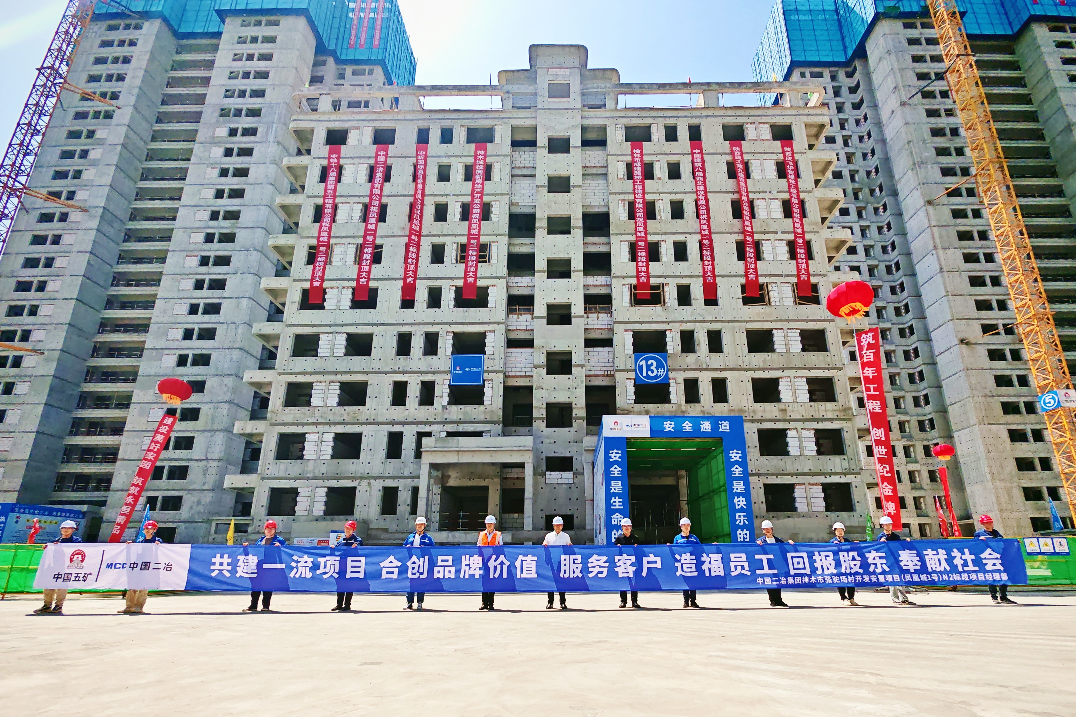 5月16日,由陜西分公司承建的神木市駱駝場村開發安置項目(鳳凰城1號)N2標段9棟主樓主體結構全部封頂。