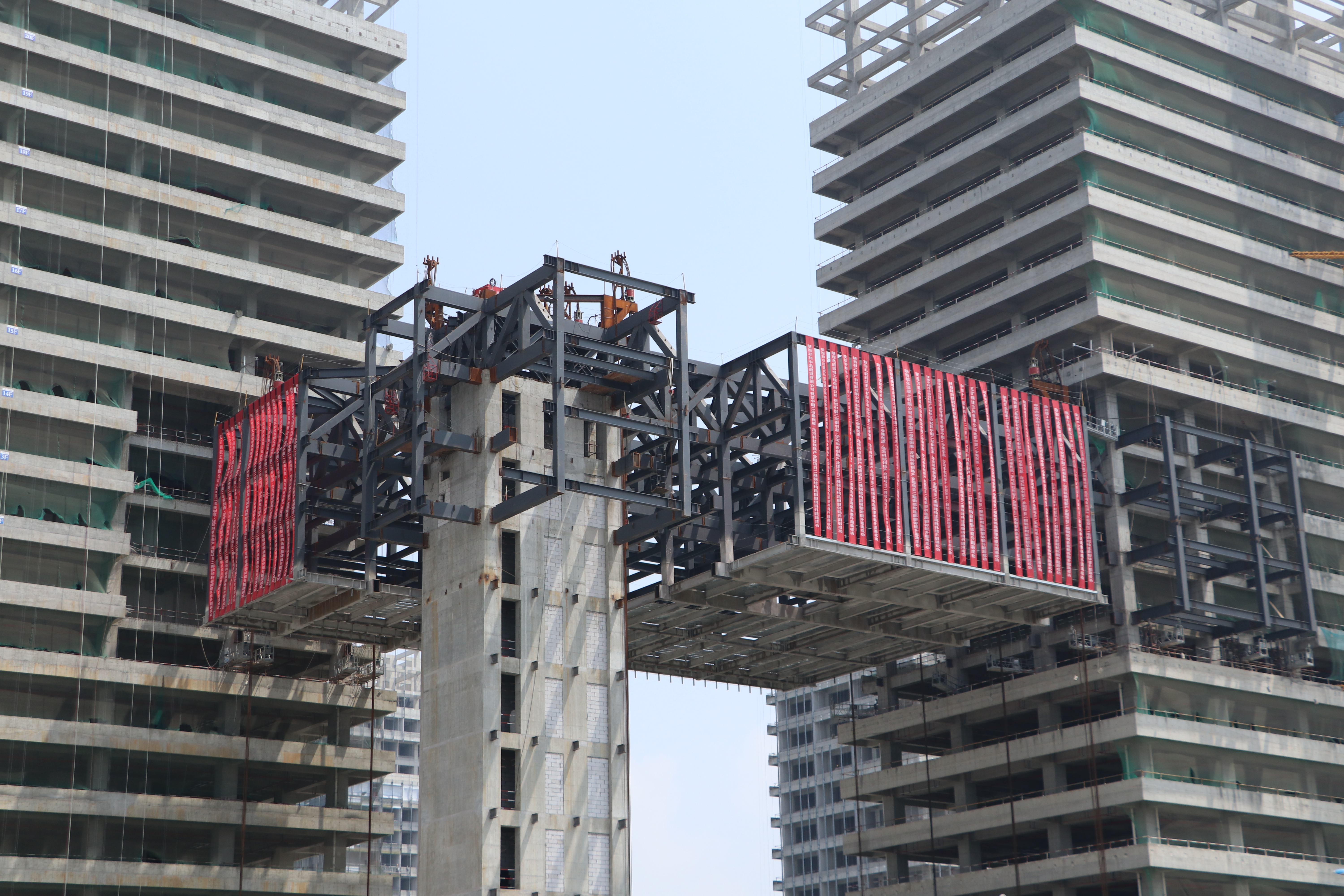 在本次提升工程中,項(xiàng)目部精心組織、科學(xué)施工,采用了先進(jìn)的鋼桁架結(jié)構(gòu)體系。鋼結(jié)構(gòu)連廊重達(dá)1818噸,距地高度59.85米,跨度44米,寬度30米。為確保施工安全和精準(zhǔn)對接,項(xiàng)目部在1#、2#及塔樓建筑之間設(shè)置了10個吊點(diǎn),并通過鋼絞線由計(jì)算機(jī)控制10臺液壓提升器同步發(fā)力,以每小時4.2米的速度緩慢拉升。同時,項(xiàng)目部還采用了全站儀、水準(zhǔn)儀、超聲探傷儀、漆膜儀、硬度儀等設(shè)備進(jìn)行實(shí)時監(jiān)測,確保鋼結(jié)構(gòu)連廊在提升過程中不出現(xiàn)“水平誤差”,保障每一個鋼構(gòu)件受力處于安全可控狀態(tài)。經(jīng)過11個小時的奮戰(zhàn),提升作業(yè)順利完成,兩座高聳入云的大樓在59.85米的高度成功實(shí)現(xiàn)高空交匯,標(biāo)志著項(xiàng)目建設(shè)取得重要階段性成果。