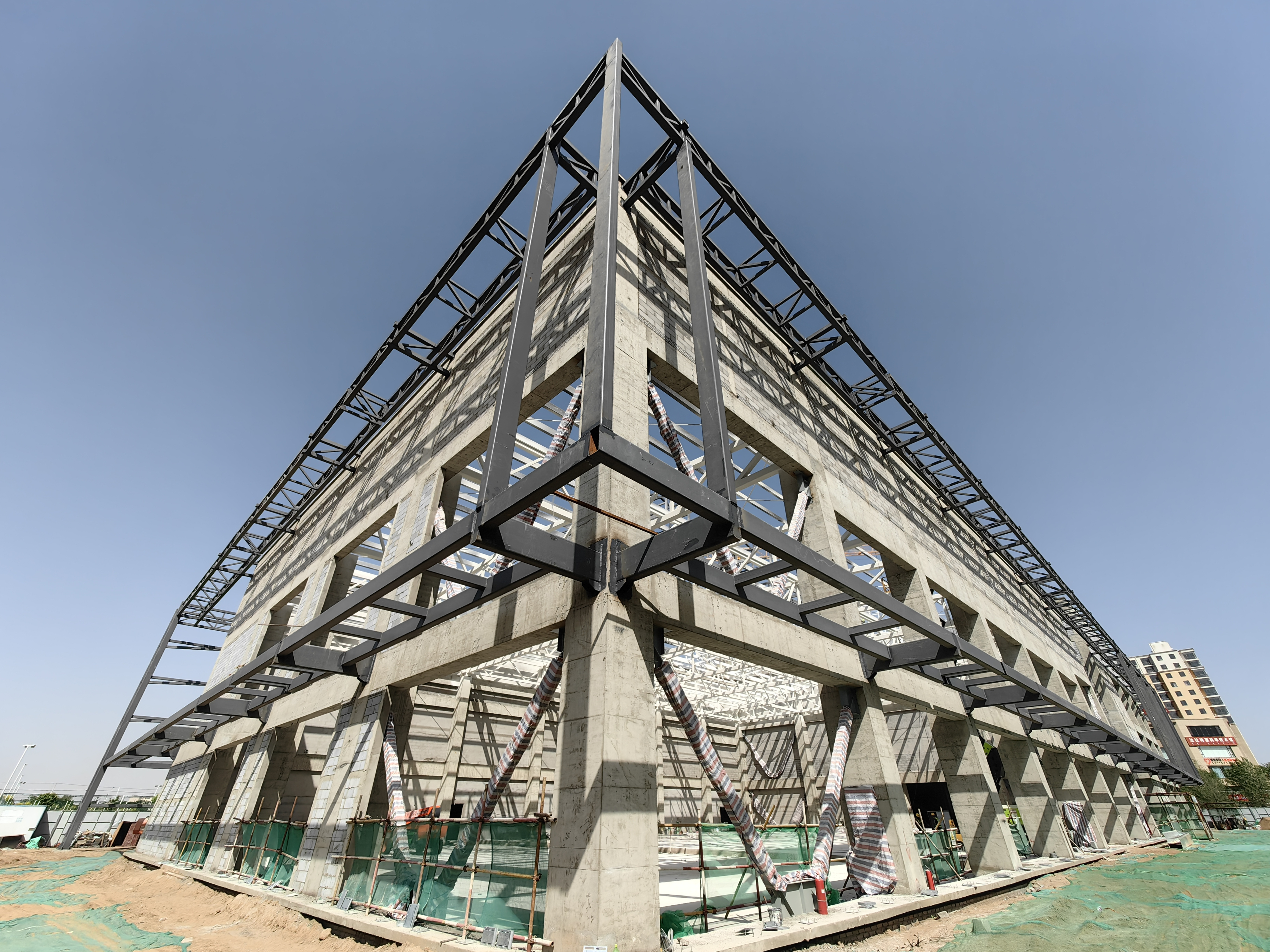 走進項目施工現(xiàn)場,在150噸履帶吊的機械轟鳴中,在作業(yè)人員嫻熟的操作技能下,項目最后一個鋼結(jié)構(gòu)外立面造型順利安裝完成。