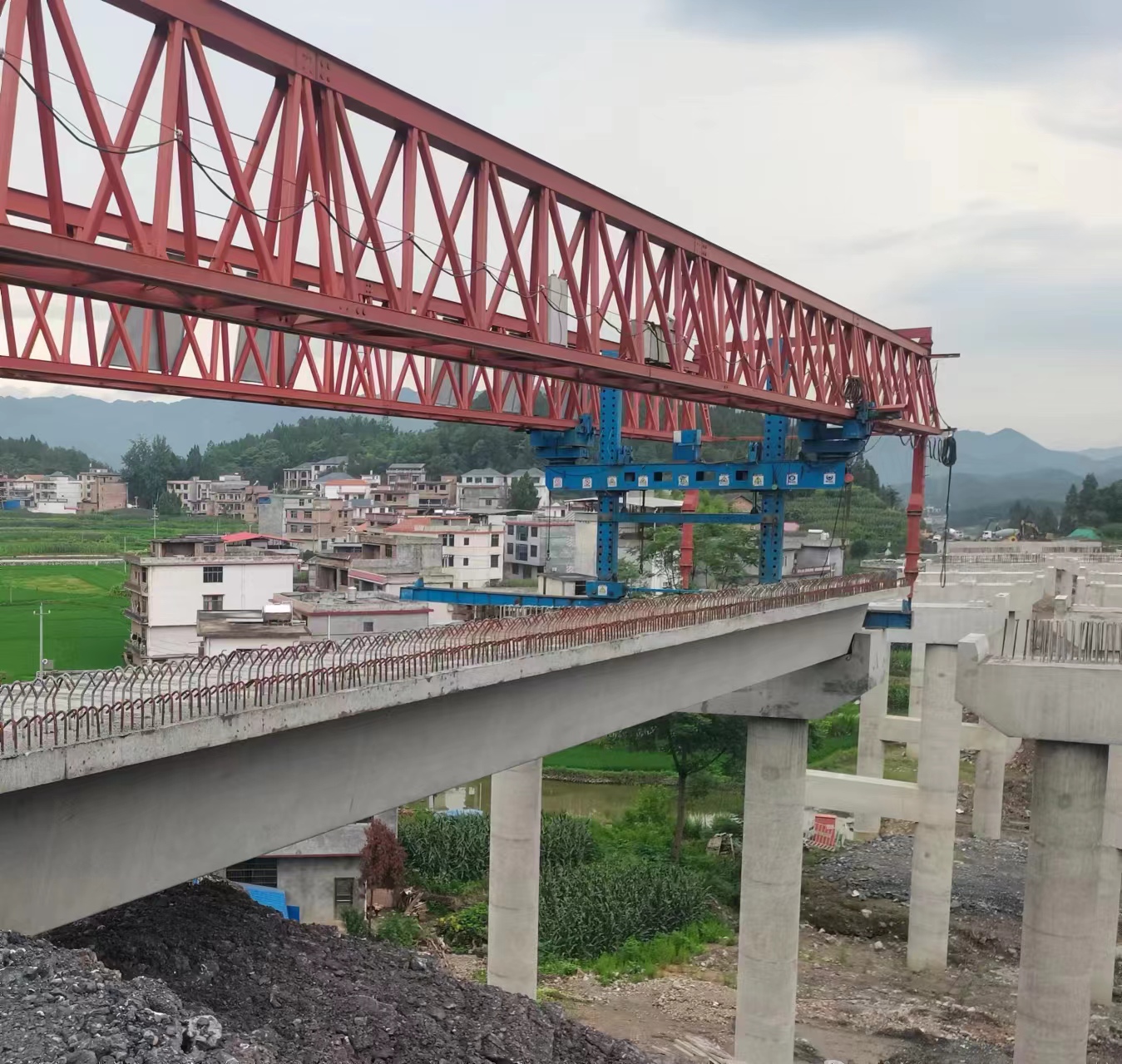 為確保桂花屋場首片箱梁順利架設,項目部提前策劃、精心組織,召開箱梁架設首件專題會,研究制定架梁方案,并在架梁前對支座、墊石等關節要素進行標準化審核驗收,對架設工人進行交底和培訓。歷時三天,架橋機安裝完畢,桂花屋場大橋首片箱梁順利架設。