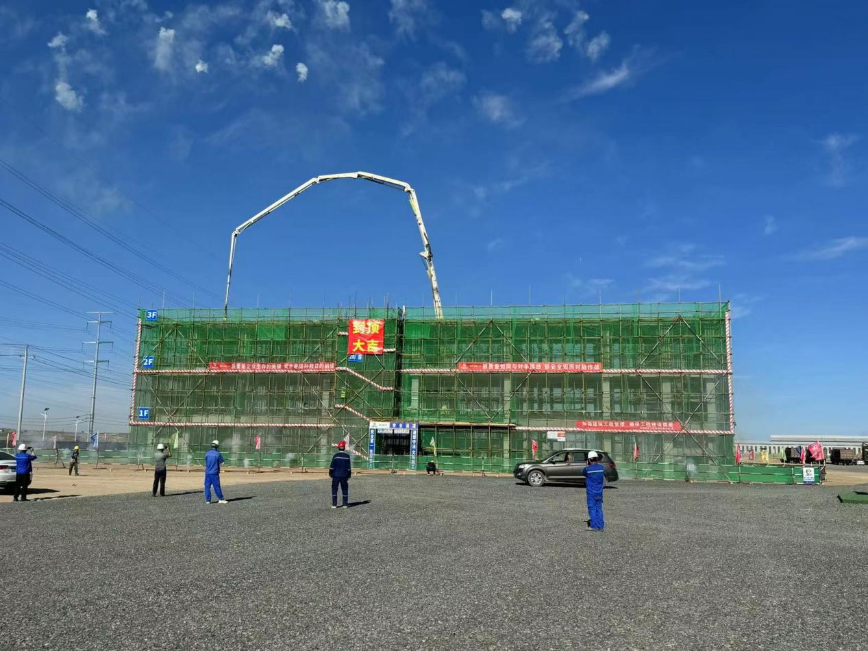 此次封頂的2#標準化廠房,長49.45米,寬108米,高13.45米,建筑面積11193平方米,其中主廠房為2層鋼結構,一層高為6.3米,二層高為7.15米。輔助用房為3層混凝土框架結構,一層高為4.45米,二 層高為4.42米,三層高為4.8米。2#標準化廠房輔助用房7月11日一層澆筑完成,7月19日二層澆筑完成,7月29日喜封金頂。