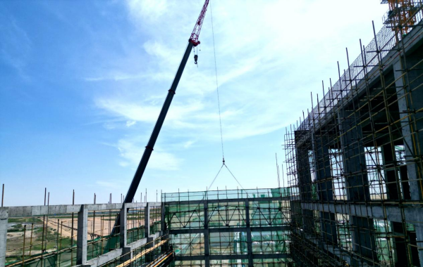 本次吊裝的鋼屋架跨度18米、梁高2.9米,距地面 18.85米,單榀重量達(dá)1.5噸。面對高溫天氣及吊裝區(qū)域環(huán)境復(fù)雜、空間狹小,土建與安裝作業(yè)交叉等多重挑戰(zhàn),項目部全員堅守崗位,一方面對現(xiàn)場管理人員與作業(yè)人員進(jìn)行周密分工,圍繞施工方法、安全操作規(guī)程等內(nèi)容開展多輪詳細(xì)培訓(xùn);另一方面在高溫條件下多次組織勘查吊裝位置、規(guī)劃吊裝路徑、優(yōu)化吊裝方案,全過程嚴(yán)把安全與質(zhì)量關(guān),確保各工序嚴(yán)格按方案推進(jìn)。
