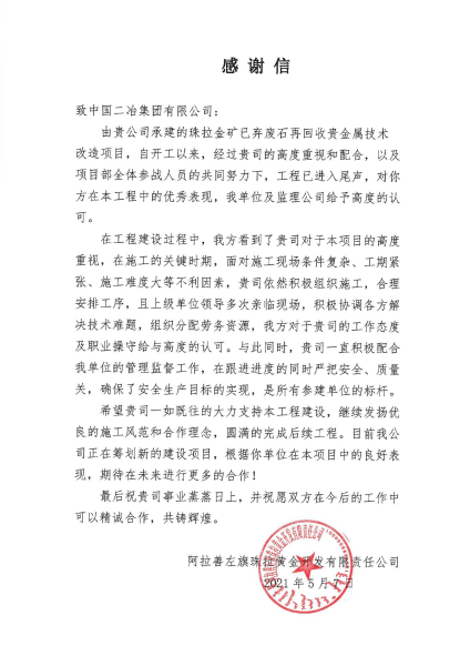 5月7日,阿拉善左旗珠拉黃金開發有限責任公司向中國二冶致感謝信。對中國二冶作為央企的實力擔當、用實際行動踐行“一天也不耽誤,一天也不懈怠”的企業精神及項目人員優秀的專業素質和過硬的技術水平給予充分的肯定和高度贊揚,對管道分公司領導給予該工程的高度重視、大力支持表示衷心感謝。