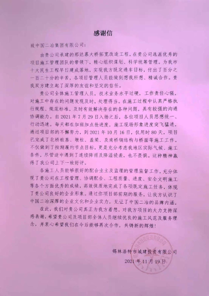 11月19日,錫林浩特市城建投資有限公司發來感謝信,對中國二冶在錫林浩特市那達慕大橋拓寬改造工程中良好的履約精神給予高度認可,對參與項目建設的全體人員付出的努力和汗水表示感謝。