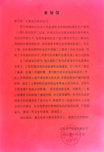 5月17日,中國二冶收到山東永寧藥業(yè)有限公司發(fā)來的感謝信,信中贊揚中國二冶在山東永寧藥業(yè)項目建設過程中,實干擔當、迎難而上、精心部署,努力克服工期緊、任務重等不利因素,在復雜嚴峻的疫情形勢下,保證材料供應和人員補充,嚴把質量關,打造精品工程,充分展現(xiàn)出央企的責任與擔當。