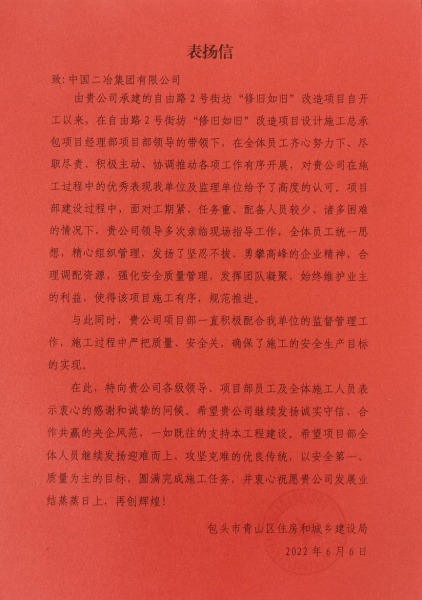 6月10日,中國二冶收到包頭市青山區(qū)住房和城鄉(xiāng)建設(shè)局發(fā)來的表揚(yáng)信。信中贊揚(yáng)中國二冶在青山區(qū)自由路2號街坊“修舊如舊”改造項目建設(shè)過程中,攻堅克難,精細(xì)部署,有序推進(jìn),以實際行動充分體現(xiàn)了二冶人的實干擔(dān)當(dāng)。