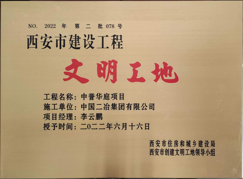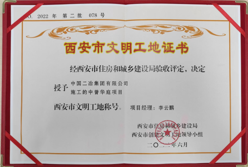 7月5日,中國二冶收到西安市住房和城鄉(xiāng)建設(shè)局頒發(fā)的榮譽證書及獎牌,由中國二冶承建的中譽華庭項目榮獲西安市“文明工地”榮譽稱號。