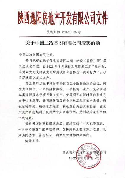9月1日,中國(guó)二冶收到陜西逸陽(yáng)房地產(chǎn)開(kāi)發(fā)有限公司發(fā)來(lái)的《關(guān)于中國(guó)二冶集團(tuán)有限公司表彰的函》。表彰函充分肯定了中國(guó)二冶陜西分公司在樂(lè)華住宅首開(kāi)區(qū)二期一標(biāo)段(香榭莊園)施工總承包項(xiàng)目復(fù)工復(fù)產(chǎn)以來(lái)展現(xiàn)出來(lái)的關(guān)鍵時(shí)刻頂?shù)米。щy面前勇攀登的央企風(fēng)范。