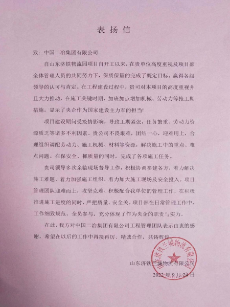 9月29日,山東濟鐵蘭城物流有限公司向中國二冶致表揚信,表揚中國二冶團結一心、迎難而上,在施工關鍵節點,加班加點搶工期,克服重重困難,保質保量完成既定目標,充分展示出央企作為國家建設主力軍的擔當作為。