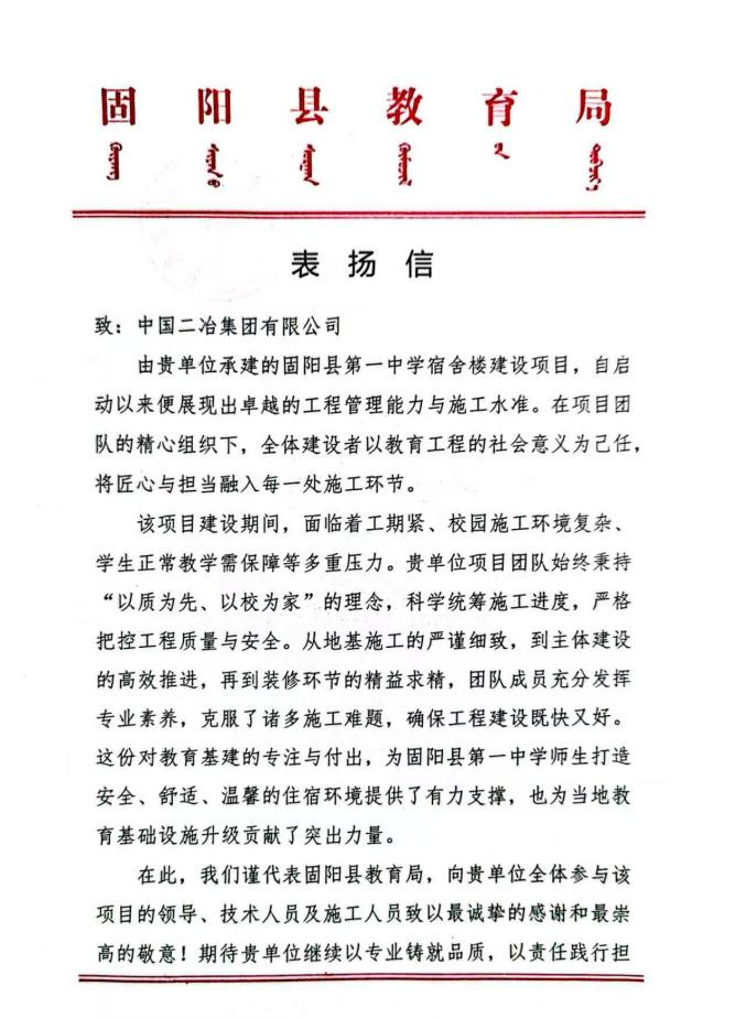 此次表揚信不僅是對項目團隊的認可,更是對中國二冶品牌實力的彰顯。公司將繼續傳承“堅韌不拔,勇攀高峰”的精神,在民生工程與教育基建領域持續發力,以專業能力踐行社會責任,為城市的發展建設貢獻力量。