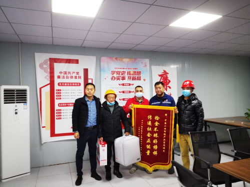 “感謝央企培養出這么好的員工!要不是你們拾金不昧、認真負責,那我們欄目損失可就大了!中國二冶好樣的,不愧是央企!這次失而復得,使我真切感受到中國二冶作為央企的責任擔當。”隨后,欄目組工作人員將一面印著“拾金不昧好榜樣,傳遞社會正能量”的錦旗送到項目負責人手中,并要給項目部一些酬謝,項目負責人婉言拒絕。