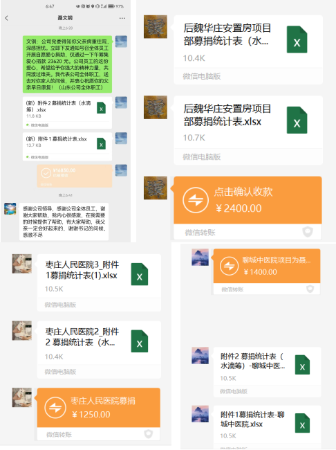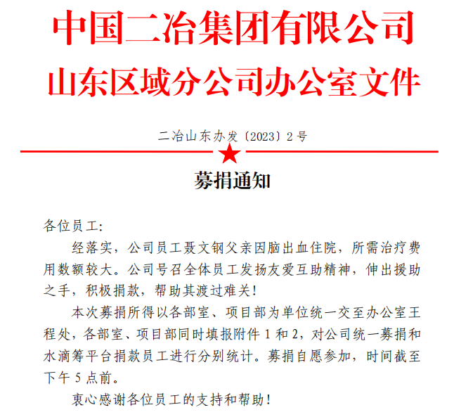 4月21日,在山東分公司工作群中,隨著一份募捐通知的下發,機關各部門、各項目部干部員工紛紛行動,為分公司曹縣安置房項目員工聶文鋼的父親進行愛心募捐。